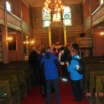 Vi gikk inn i kirken, guiden kunne fortelle at kirken var den tredje som var bygd her på plassen. I 1854 sto denne kirken ferdig. Til 75-årsjubileet ble kirken pusset opp. Karl Meilender betalte utsmykningen. Nye glassmalerier ble satt inn, og det store maleriet bak alteret ble malt av Martin Førland fra Kvinesdal. I dag er kirken malt i rosa og lys grønn med vakre dekoreringer. Tømmeret var skåret i Fotland. Arkitekt Bosch tegnet denne store, åttekantede kirken. Her er gudstjeneste annen hver søndag.