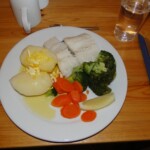 Deretter gikk turen til Sørevågen for middag på ”Krambuloftet”.Til middag ble det servert lettsaltet torsk og dronning Maud pudding og kaffe til dessert. Alt smakte veldig godt.