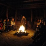 Vi ble først invitert inn i ”Bronsealderhuset”, et av de 3 rekonstruerte husene på Landa. Vi benket oss rundt et åpent ildsted.