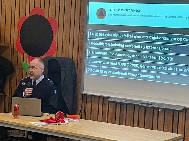 Fra SIVILFORSVARET kom Emil Torkildsen og han orienterte om Sivilforsvarets rolle i fred, krise og krig. Sivilforsvaret er en norsk statlig beredskaps- og redningsressurs underlagt Direktoratet for samfunnssikkerhet og beredskap (DSB). Formålet er å støtte samfunnet ved kriser, ulykker og krig.